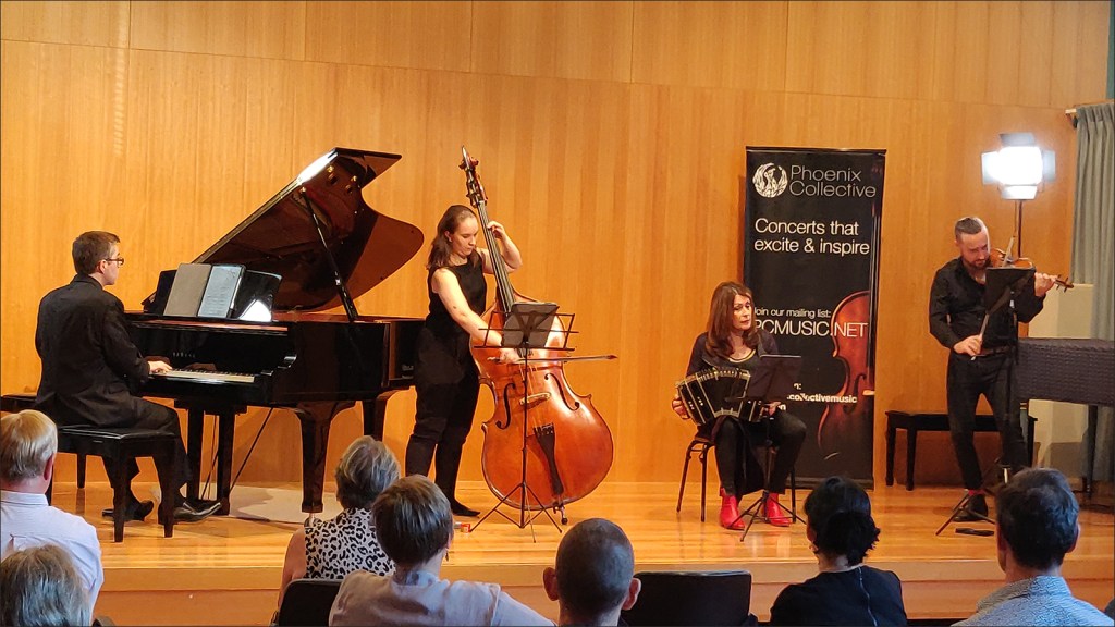 Image: Ann Smith: Maggie Ferguson (bandoneón), Dan Russell (violin), Isabelle Brown (double bass), and Edward Neenman (piano) playing the Knife In The Boot series for the Phoenix Collective at the Wesley Music Centre in Canberra on 5 March 2021.